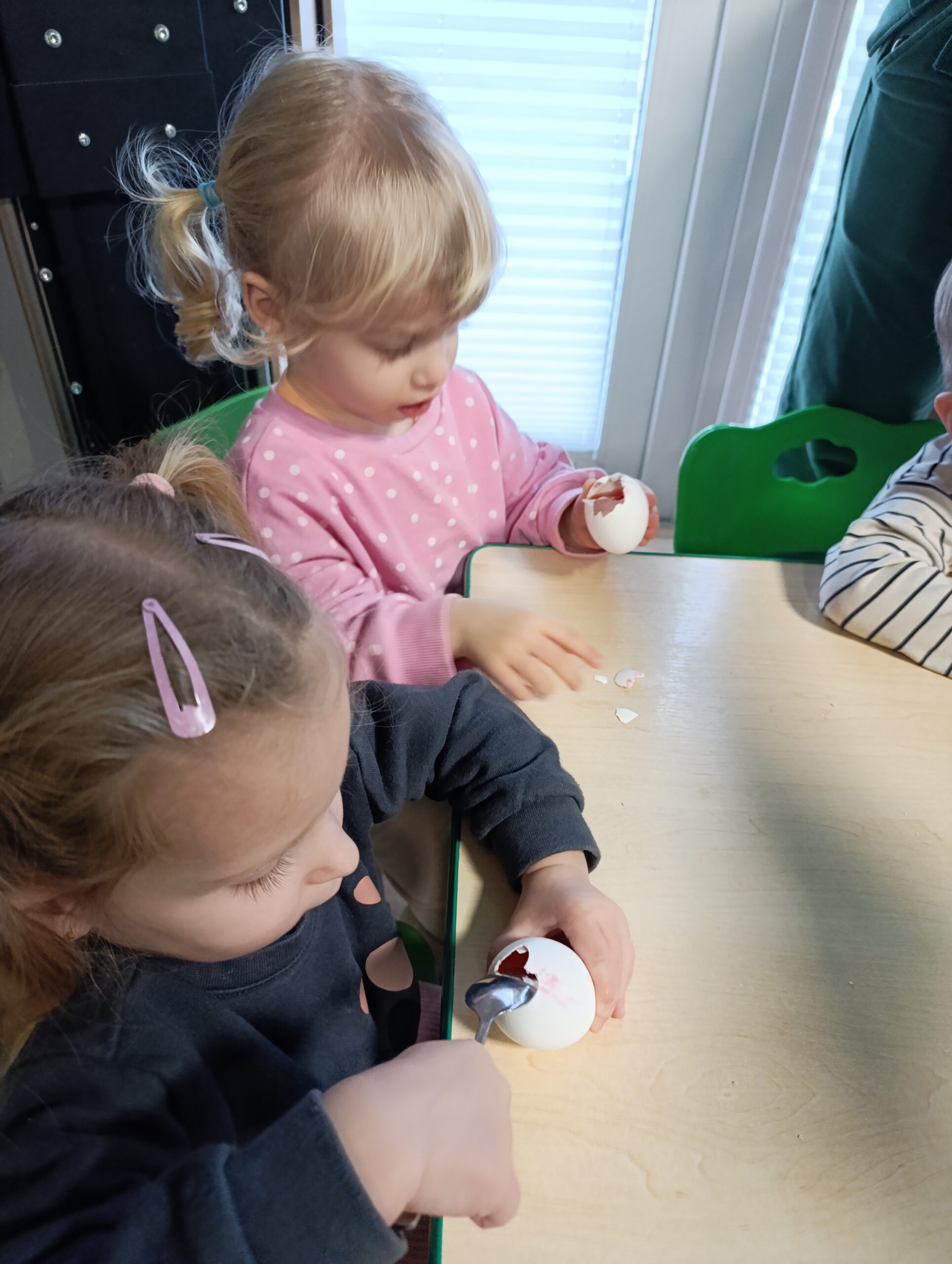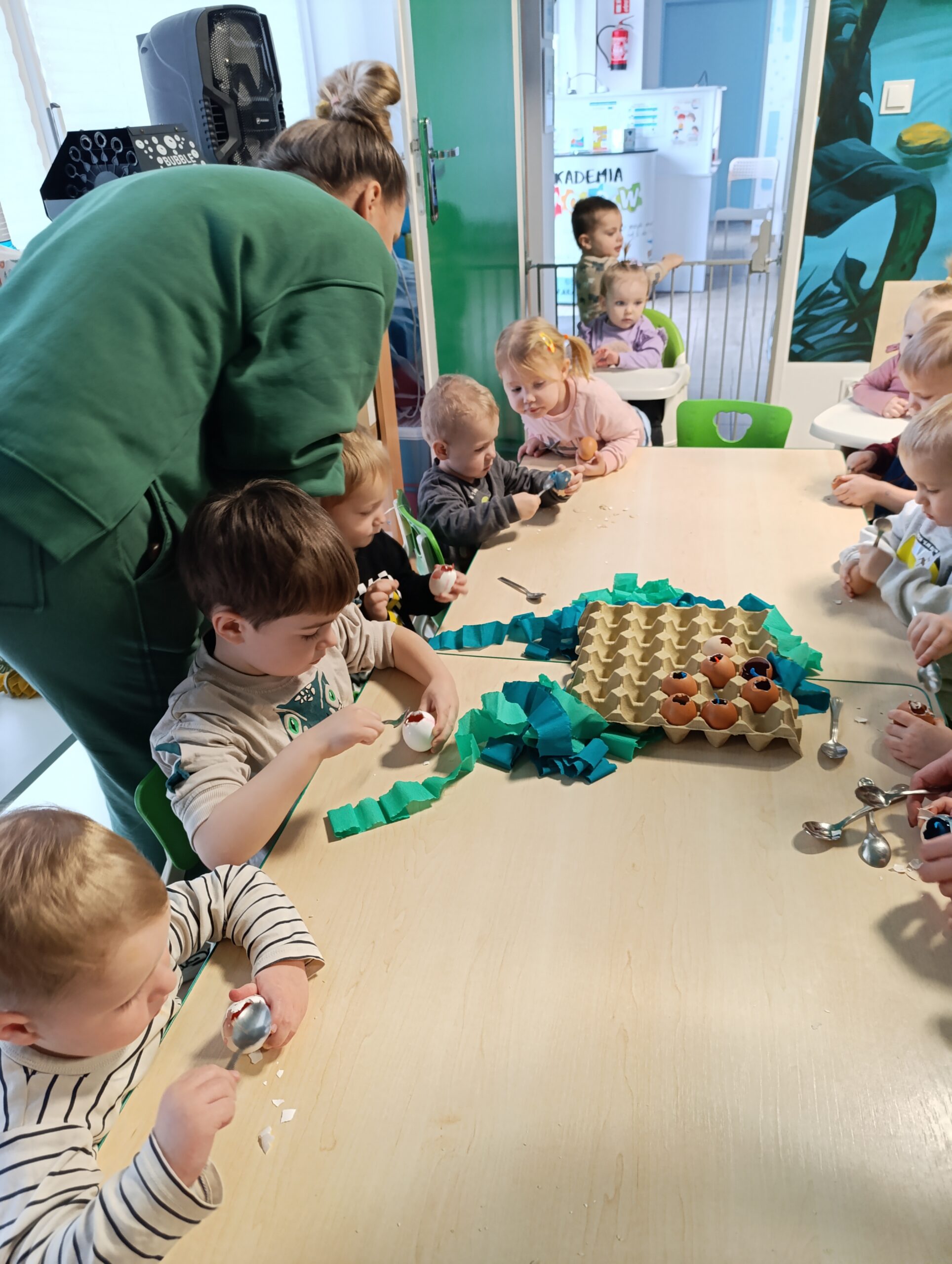 Po dynamicznych zabawach nadszedł czas na prawdziwą pracę paleontologów! Dzieci wcieliły się w odkrywców i z ogromnym zaangażowaniem odkopywały kości dinozaurów, a na koniec miały okazję obserwować, jak z jajek wykluwają się małe dinozaury! 🥚✨
