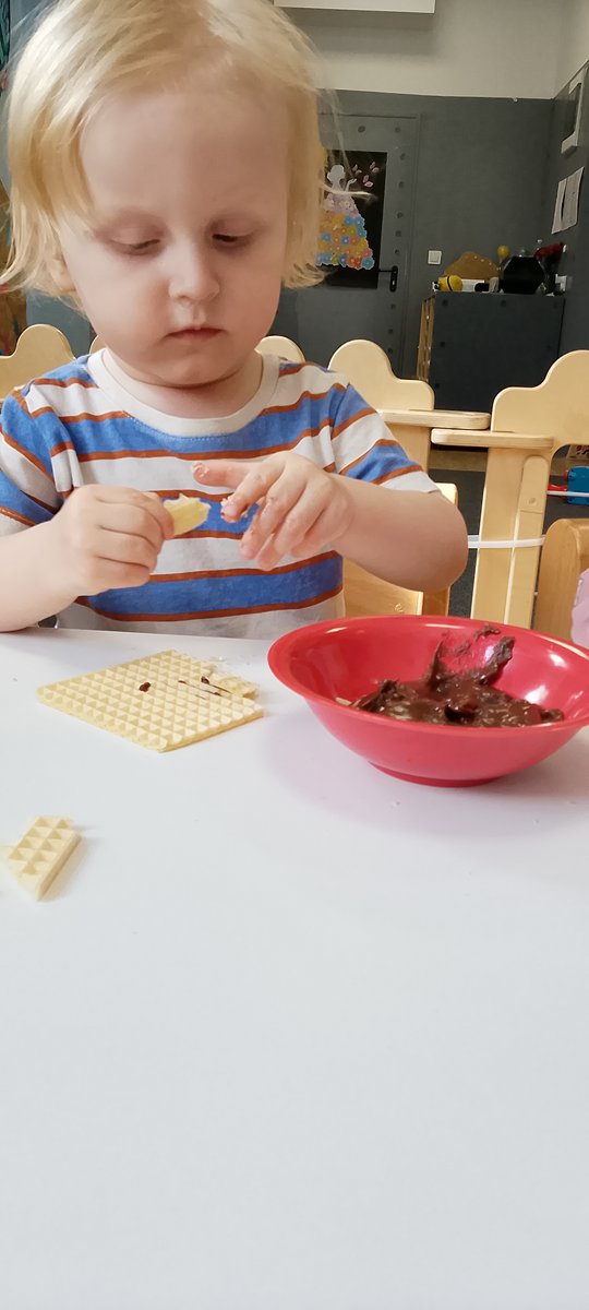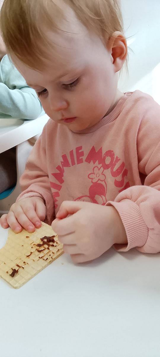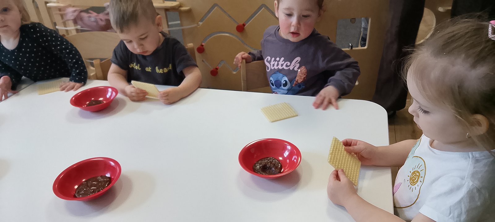 Nasze maluchy miały okazję odkrywać czekoladę wszystkimi zmysłami. Najwięcej frajdy sprawiło malowanie paluszkami po chrupiących andrutach – powstały prawdziwe, małe dzieła sztuki! Dzieci z ogromnym zaangażowaniem tworzyły swoje kompozycje, rozwijając przy tym wyobraźnię i zdolności manualne.
