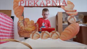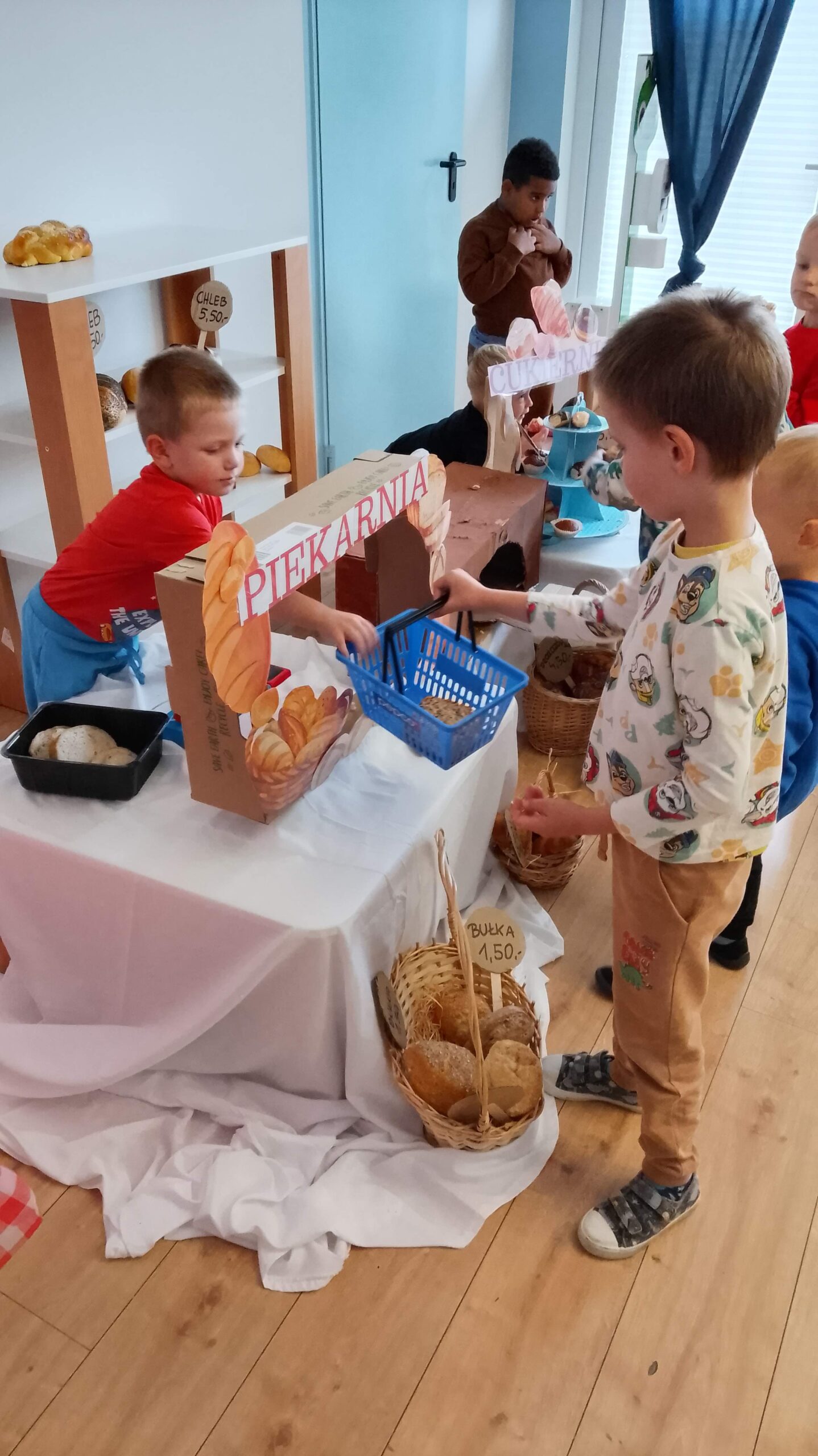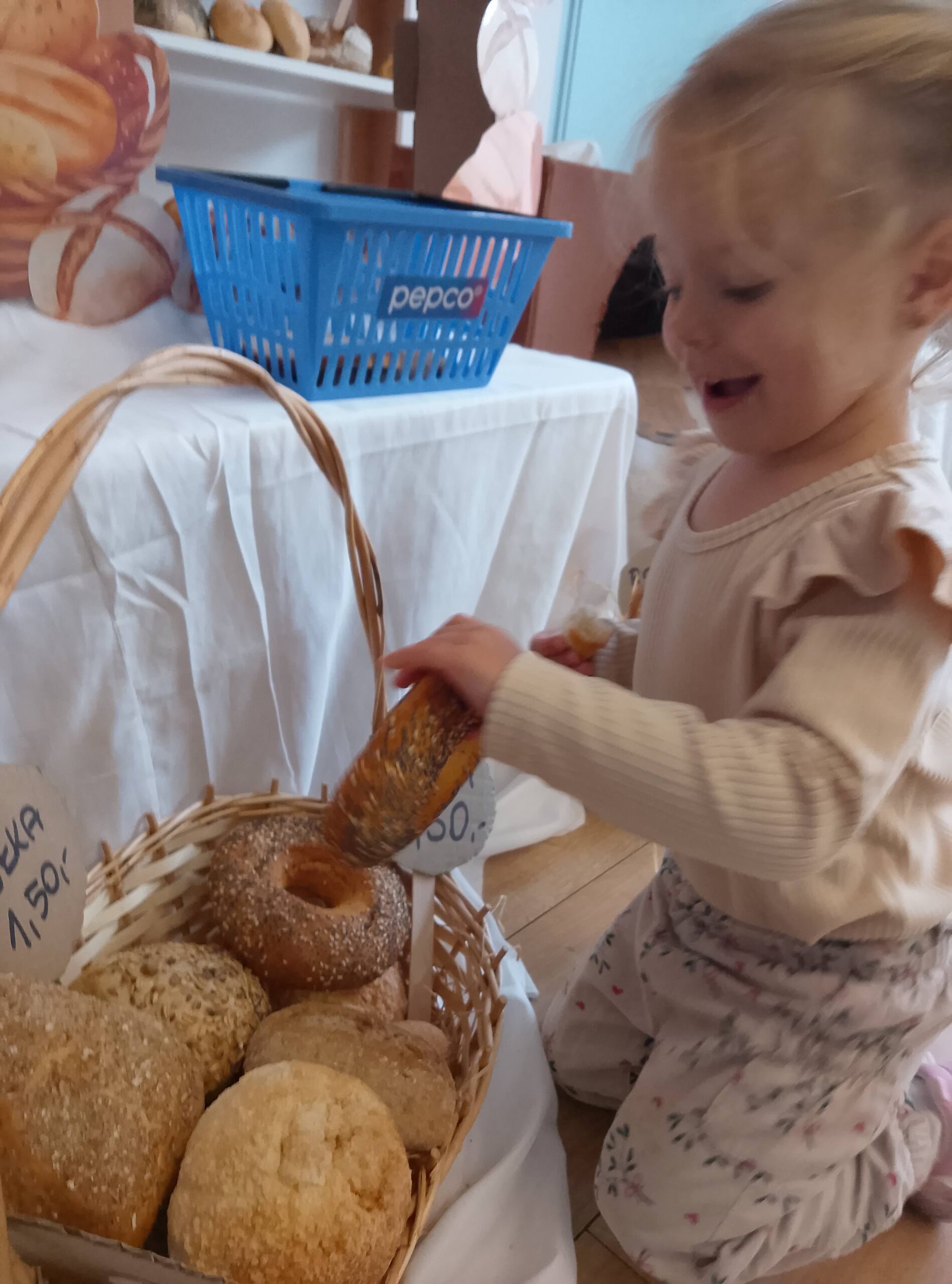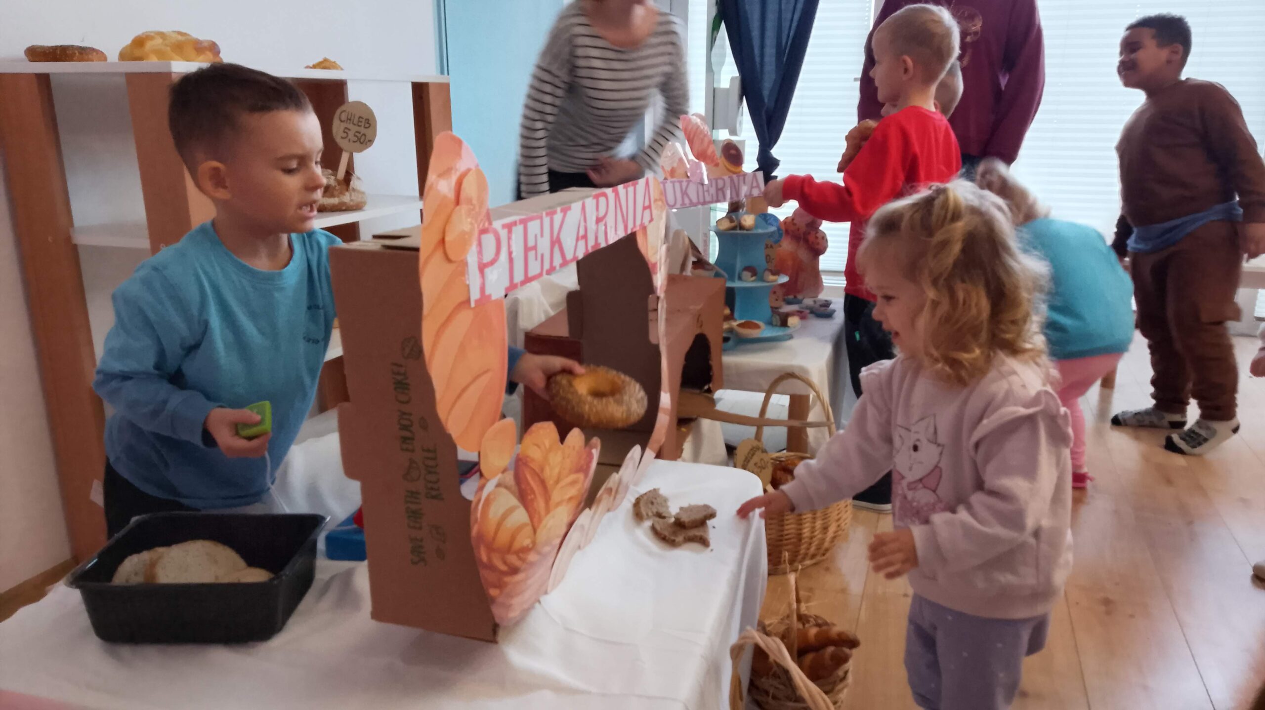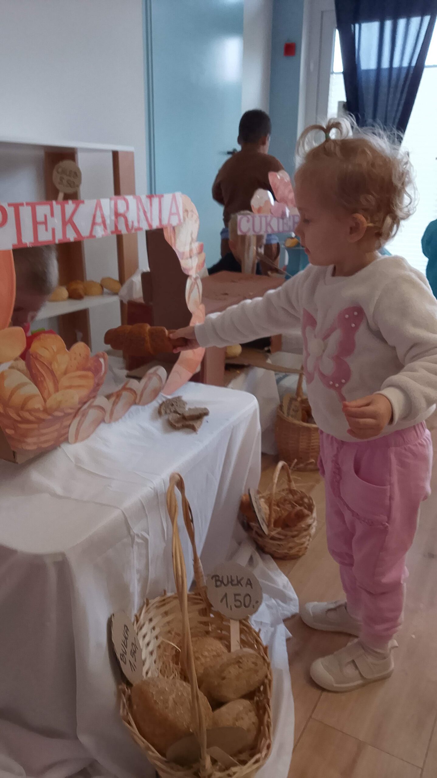 Tego dnia nasza placówka zamieniła się w prawdziwą piekarnię i cukiernię. Dzieci miały okazję wcielić się w role piekarzy, cukierników i sprzedawców. Na naszych stoiskach pojawiły się bochenki chleba, chrupiące bułeczki i pyszne rogaliki. Zabawa w sklep była pełna śmiechu i radości — każdy mógł „kupić” coś pysznego i poczuć się jak w prawdziwej piekarni.