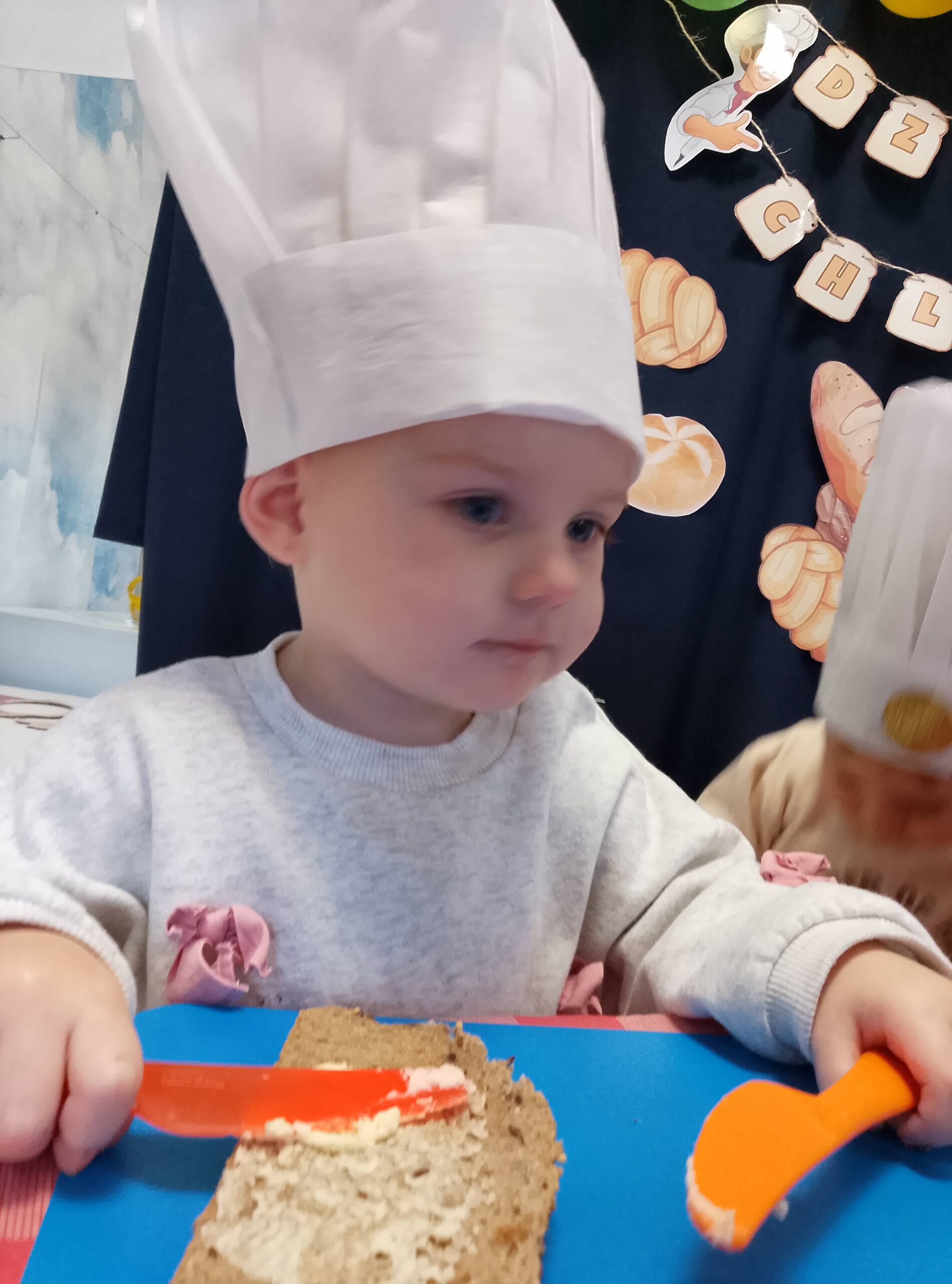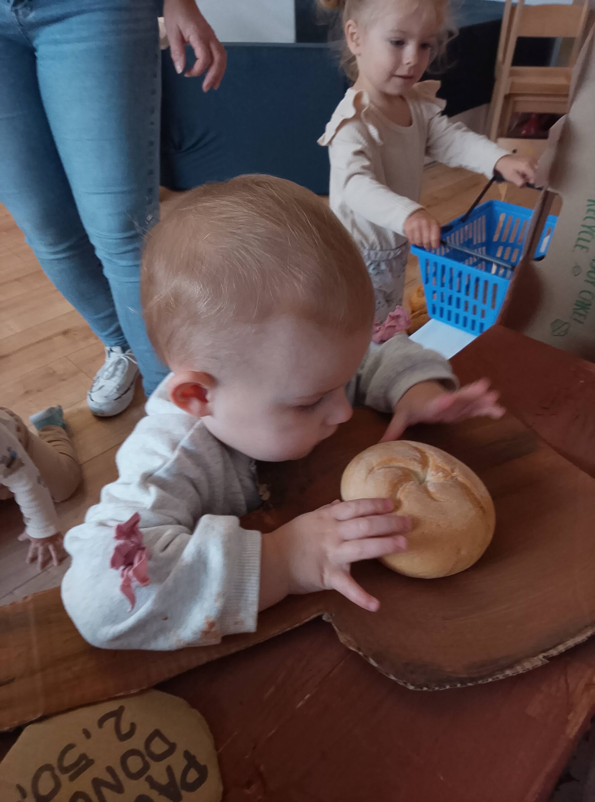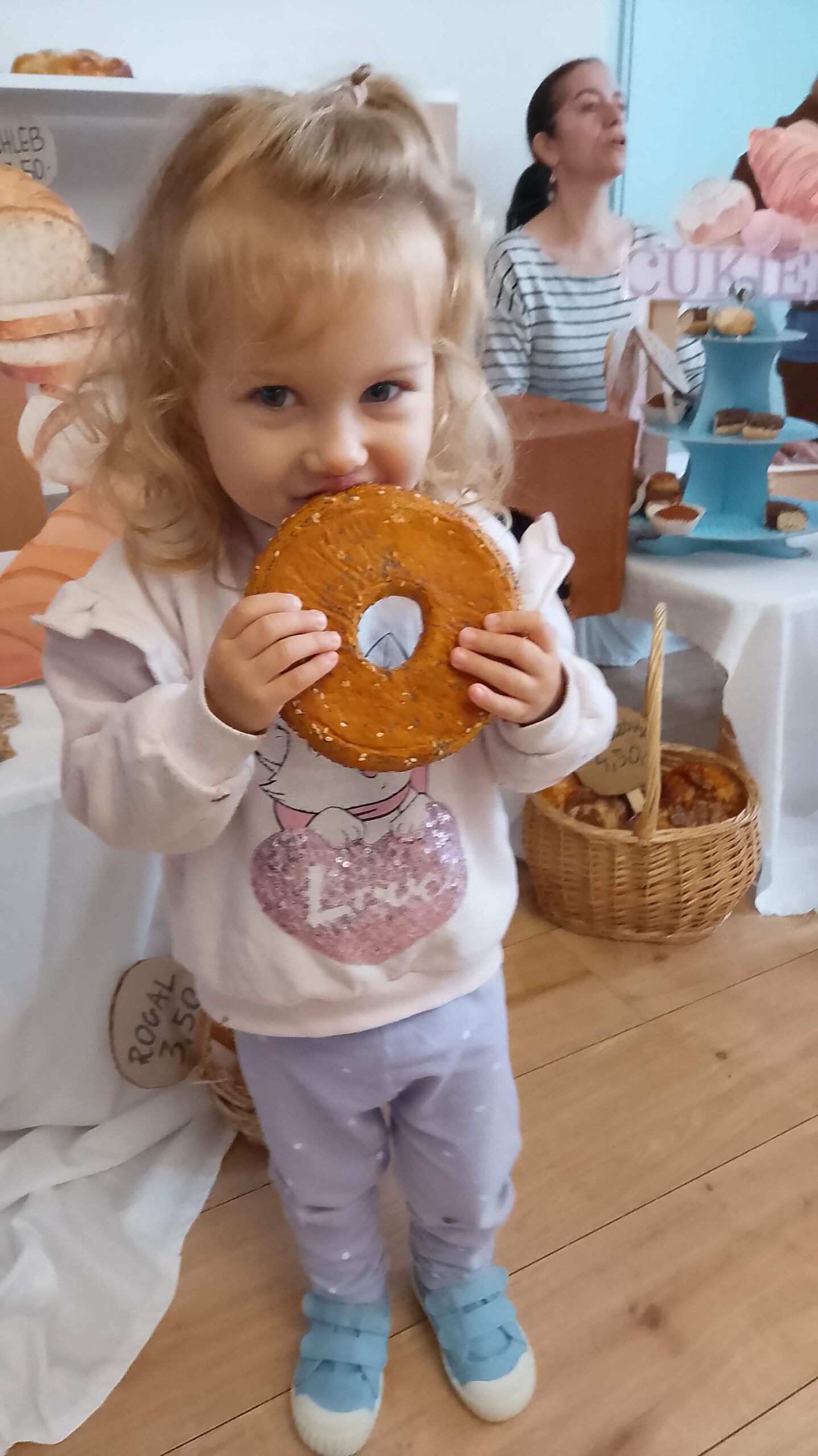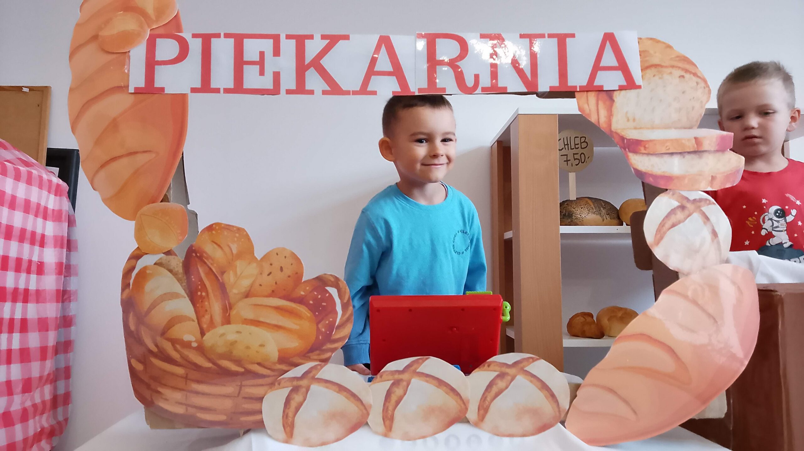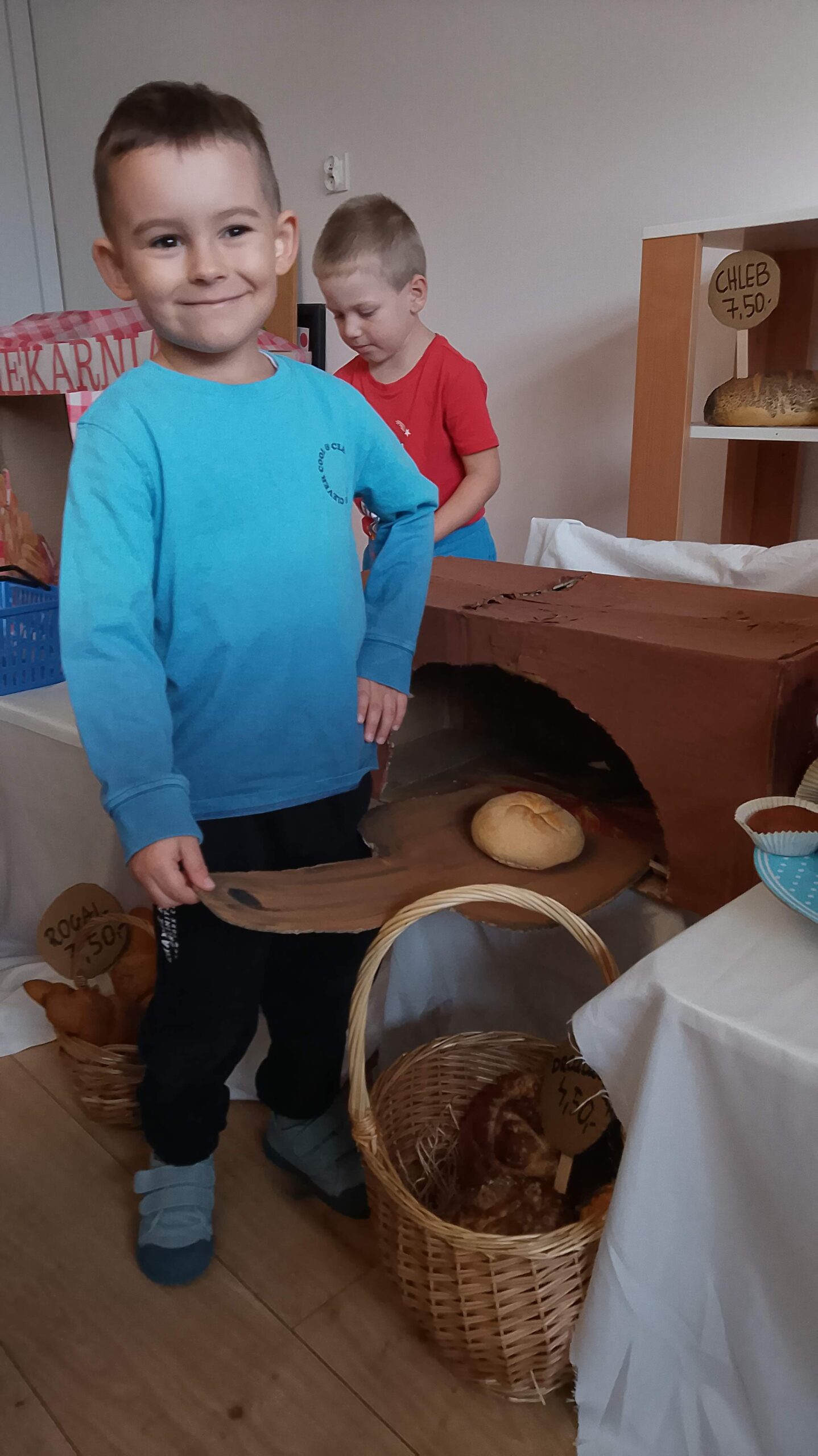 Tego dnia nasza placówka zamieniła się w prawdziwą piekarnię i cukiernię. Dzieci miały okazję wcielić się w role piekarzy, cukierników i sprzedawców. Na naszych stoiskach pojawiły się bochenki chleba, chrupiące bułeczki i pyszne rogaliki. Zabawa w sklep była pełna śmiechu i radości — każdy mógł „kupić” coś pysznego i poczuć się jak w prawdziwej piekarni.