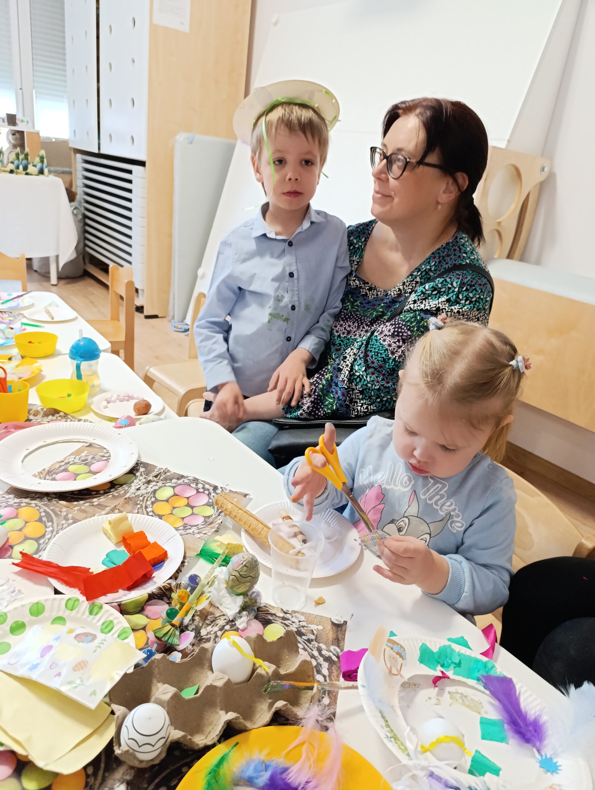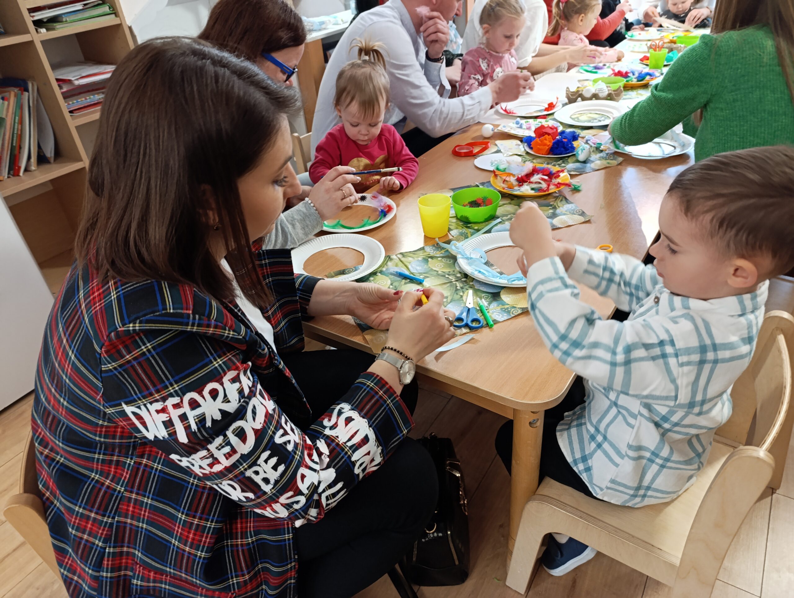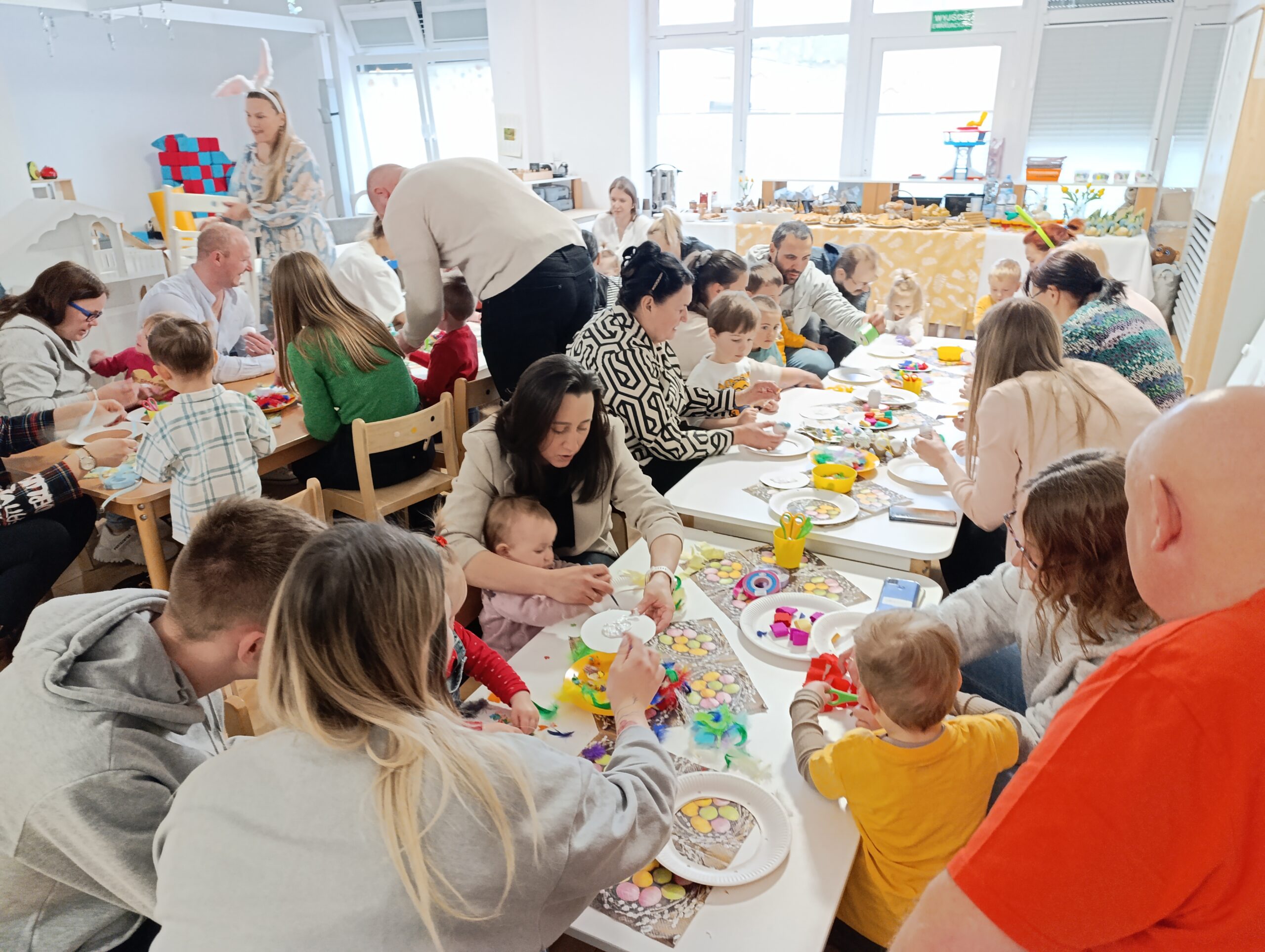 Po części artystycznej przyszedł czas na wspólną zabawę – rodzice razem z dziećmi ruszyli do tańca, a następnie wszyscy wzięli udział w warsztatach plastycznych. W miłej, twórczej atmosferze powstawały piękne łapacze snów oraz kolorowe, ręcznie malowane pisanki.