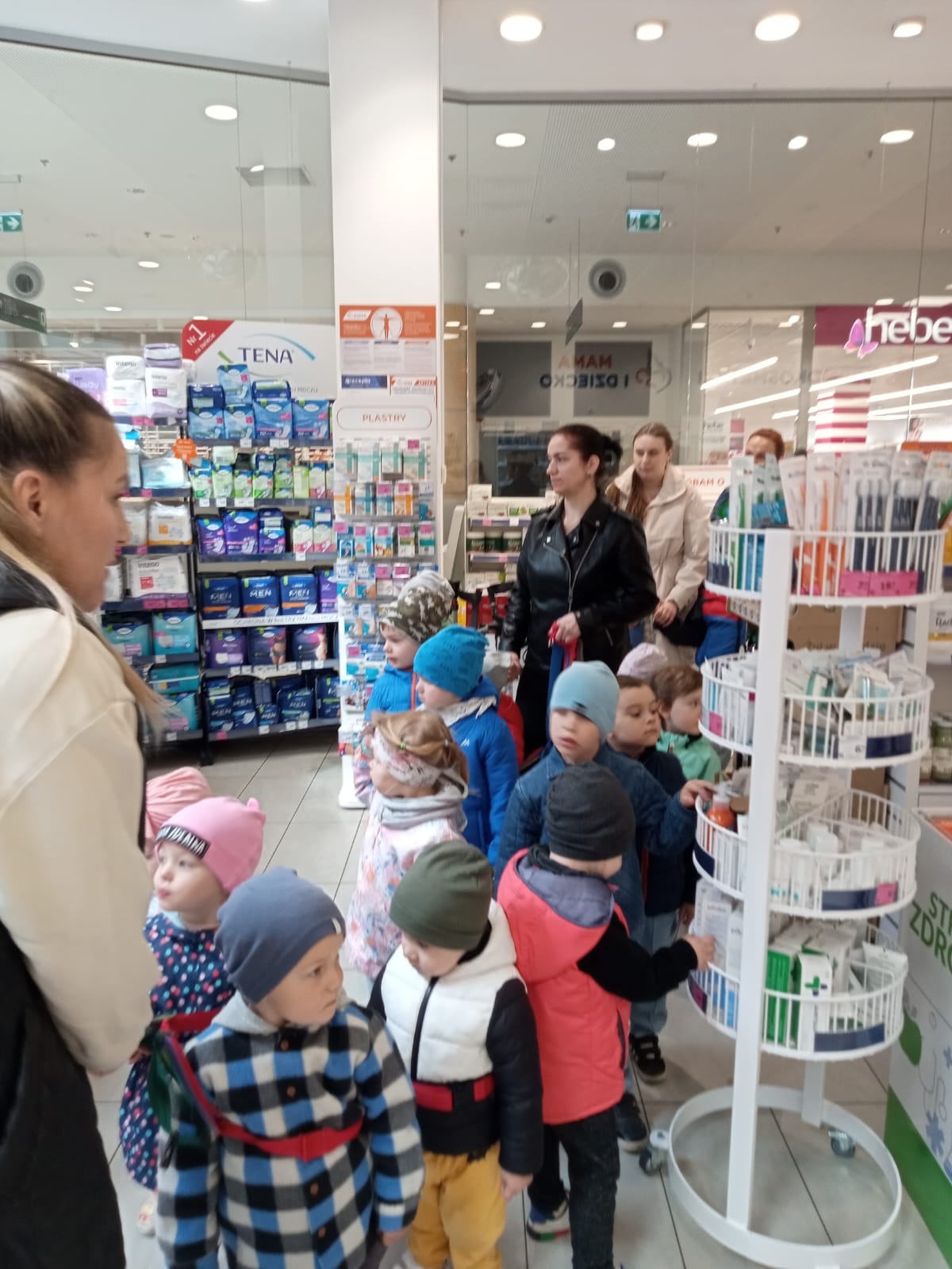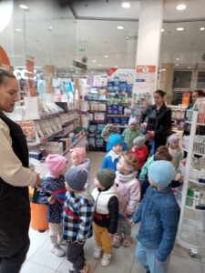 Nasze przedszkolaki z ogromnym zainteresowaniem słuchały opowieści o tym, jak wygląda codzienna praca w aptece i jak wielki wysiłek oraz zaangażowanie wkładają farmaceuci, by pomagać innym. Z radością wręczyły naszym gospodarzom własnoręcznie przygotowane podziękowania – pełne kolorów, uśmiechów i ciepłych słów wdzięczności.